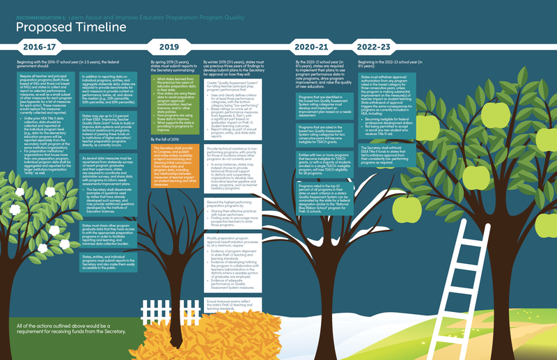 - Ensure reporting of educator preparation program outcome measures—such as the percent of recent graduates who are working in full-time positions and graduates’ impact on student learning—that can provide valuable insights to the preparation field and those it serves.